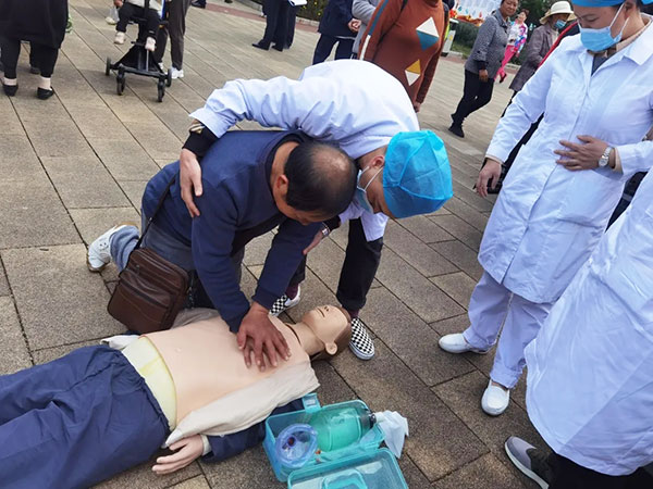 志愿者們還現(xiàn)場教學(xué)徒手心肺復(fù)蘇,吸引了不少市民圍觀學(xué)習(xí),在示范過程中,大家屏氣凝神,認(rèn)真傾聽,提高了群眾對心肺復(fù)蘇重要性、必要性的認(rèn)識和隨時判斷心跳驟停第一時間進(jìn)行搶救的意識與能力。