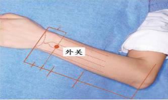 (4)外關(guān):前臂背側(cè),陽池穴與肘尖穴的連線上,腕背橫紋上2寸,尺骨與橈骨之間。