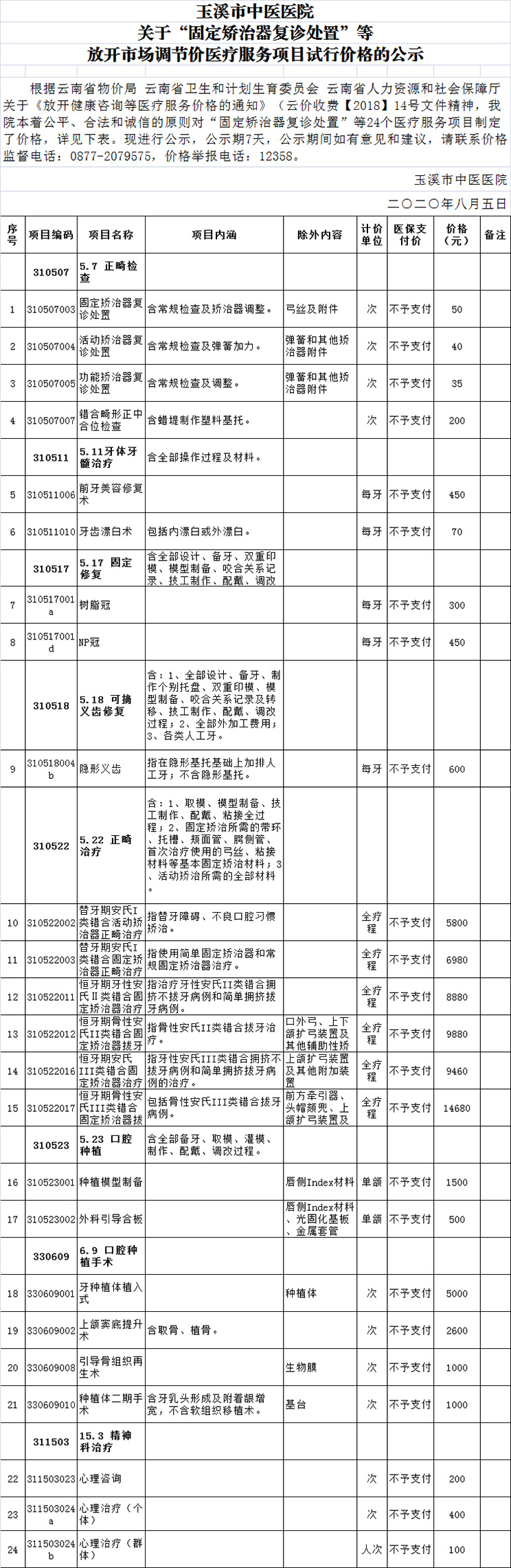 玉溪市中醫(yī)醫(yī)院關(guān)于“固定矯治器復(fù)診處置”等放開市場(chǎng)調(diào)節(jié)價(jià)醫(yī)療服務(wù)項(xiàng)目試行價(jià)格的公示