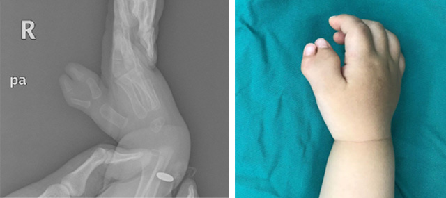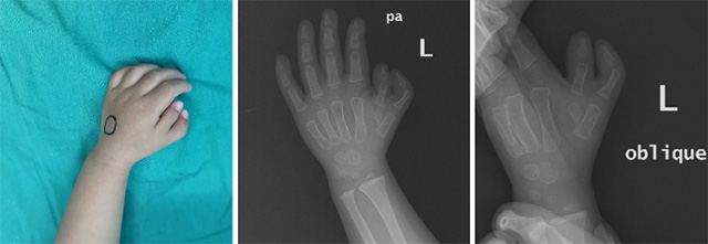 圖為患兒1的術(shù)前手外觀及影象學(xué)資料