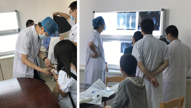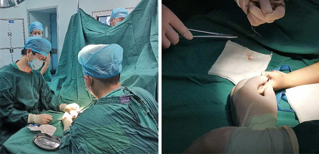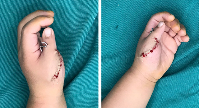 考慮患兒為復(fù)雜的復(fù)拇畸形,由于手部解剖結(jié)構(gòu)復(fù)雜,手術(shù)難度大,術(shù)后繼發(fā)性畸形和功能不良的發(fā)生率很高,小兒骨科邀請(qǐng)到重慶醫(yī)科大學(xué)附屬兒童醫(yī)院骨科手外科專家南國(guó)新教授進(jìn)行會(huì)診及手術(shù)指導(dǎo)。經(jīng)我院小兒骨科和南國(guó)新教授的配合,對(duì)兩例復(fù)雜的復(fù)拇畸形患兒進(jìn)行了多指切除、截骨矯正、掌骨截骨矯正拇指嫁接成形、屈指肌腱轉(zhuǎn)位、掌指關(guān)節(jié)成形、任意皮瓣形成術(shù)等手術(shù)治療,手術(shù)歷經(jīng)2小時(shí),圓滿順利完成。