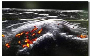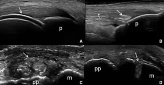 骨關(guān)節(jié)炎:在骨關(guān)節(jié)炎中,盡管常規(guī)放射照相仍然是金標(biāo)準(zhǔn),但超聲可以用來確認(rèn)診斷并與其他關(guān)節(jié)炎相鑒別?;ぱ谆蚨嗥绽招盘?hào)顯示炎癥活躍。膝關(guān)節(jié)周圍軟組織損傷在膝關(guān)節(jié)骨性關(guān)節(jié)炎(KOA)的發(fā)病過程中起到了重要的作用,肌骨超聲可以清晰的反映KOA患者膝關(guān)節(jié)周圍軟組織損傷??梢詫?duì)損傷部位進(jìn)行明確定位,并且能對(duì)KOA病變進(jìn)行早期篩查,肌骨超聲檢查在KOA患者的診斷中有著不可替代的作用。