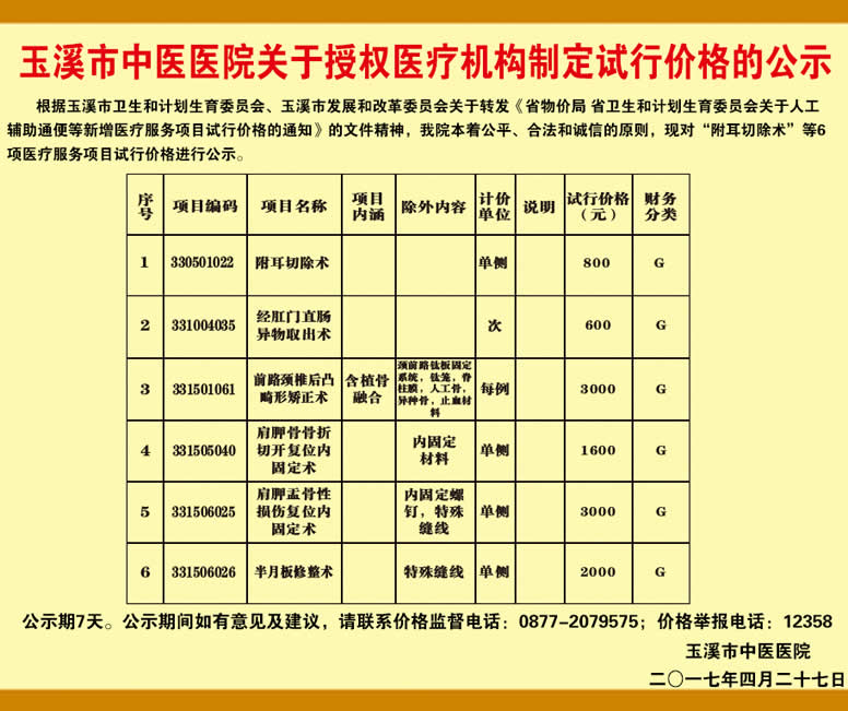 玉溪市中醫(yī)醫(yī)院關(guān)于授權(quán)醫(yī)療機(jī)構(gòu)制定試行價(jià)格的公示