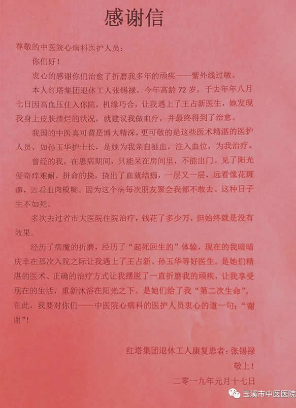 中醫(yī)療法治愈他多年頑疾 | 一封感謝信 濃濃醫(yī)患情