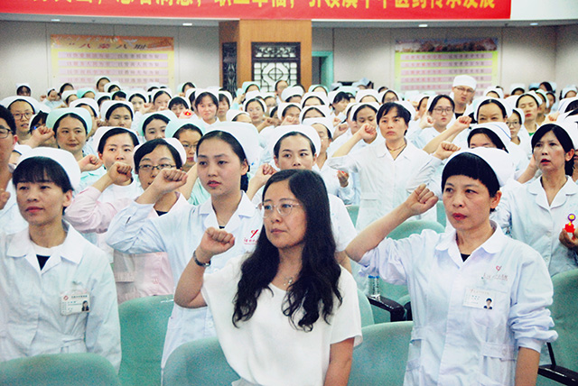晚會舉行了莊嚴(yán)的宣誓儀式。醫(yī)院護(hù)理前輩手托著南丁格爾傳承百年的燭光,傳遞到新生一代護(hù)理工作者手中。全體護(hù)理工作者莊嚴(yán)宣誓:“我將遵守護(hù)士的職業(yè)道德規(guī)范,以真心、愛心和責(zé)任心對待每一位病人……”一句句神圣的誓詞、一聲聲真摯的話語,表達(dá)了白衣天使們志愿獻(xiàn)身護(hù)理事業(yè)的決心。