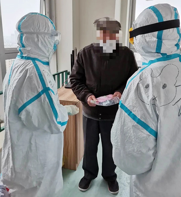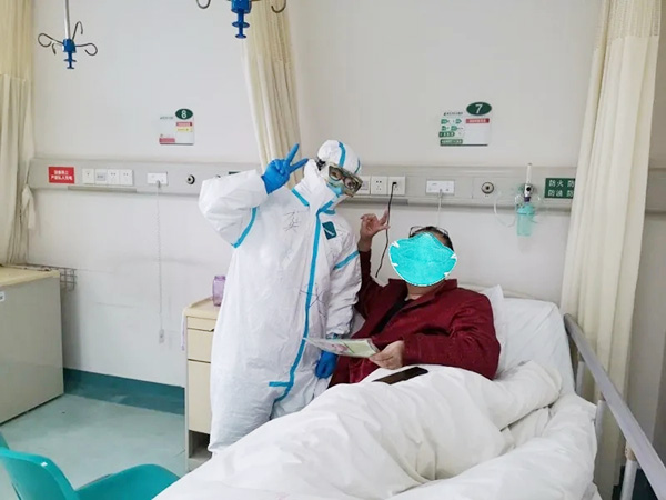 我見狀安慰了她一會兒,看她情緒稍穩(wěn)后去報告了蔡護(hù)士長,護(hù)士長暫時放下手里的事情,趕緊跑過去看望并安慰4床阿姨。在交談中我們得知,這位阿姨退休前是一位護(hù)士長,是我們護(hù)理隊伍的前輩。情緒漸漸平復(fù)后,阿姨說:“我非常能理解你們的心情,你們很辛苦,大老遠(yuǎn)跑過來幫助我們,我們不能給你們添麻煩。我只是一下沒控制住自己的情緒哭了,這會兒沒事了,謝謝你們!”她一邊說一邊趕緊擦干了眼淚,似乎是為了不再麻煩我們。在這些新冠病毒肺炎患者身上,也有各自不同的悲傷,病痛已在折磨著他們,卻還要承受生離死別。我們雖然不能感同身受,卻可以用心去溫暖、去陪伴她們度過最艱難的時刻。