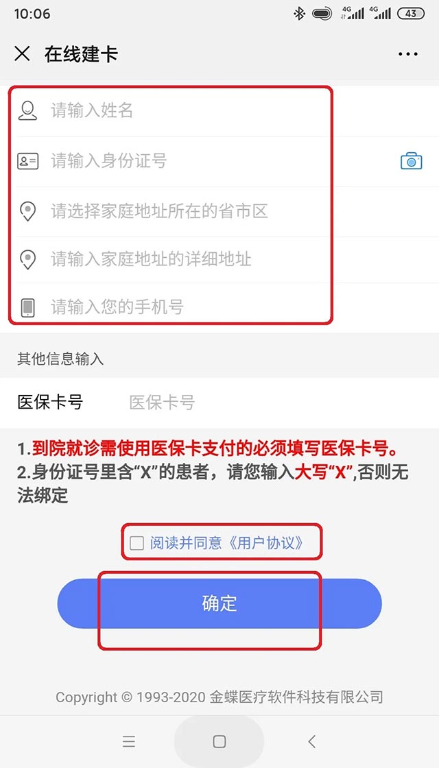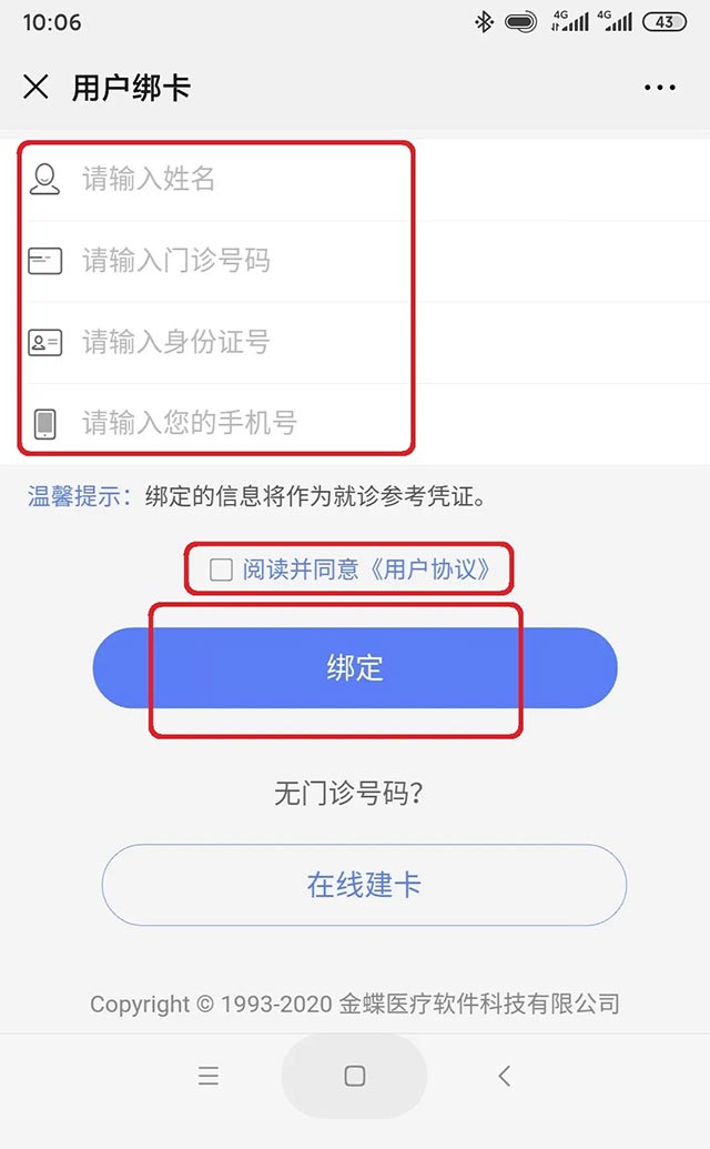 ①輸入信息(姓名、門診卡號、身份證號、手機號),勾選協(xié)議,點擊綁定