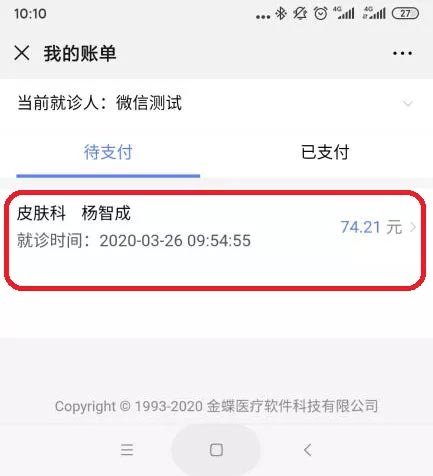 醫(yī)生看診完畢后發(fā)送電子處方,回到公眾號首頁,點擊【診療】—【我的賬單】,就會看到醫(yī)生開具的處方賬單