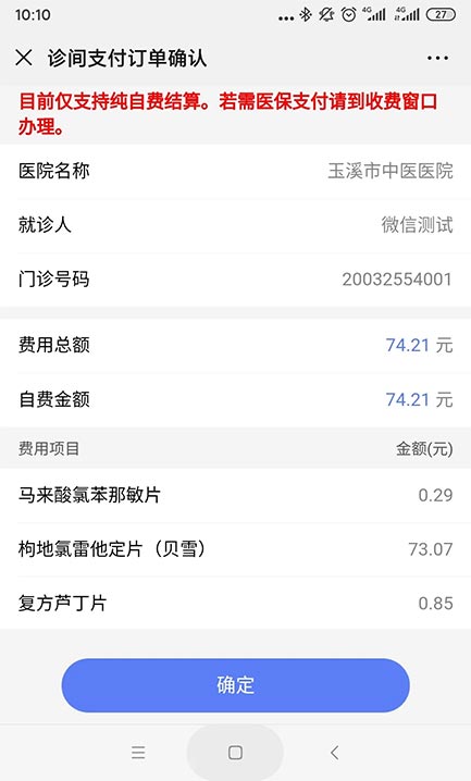 點擊待支付處方,可以查看處方明細,確認無誤后點擊確定進行交費