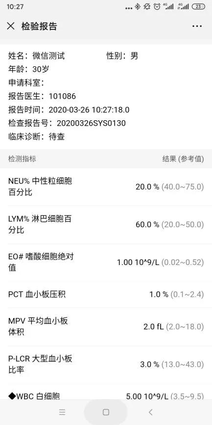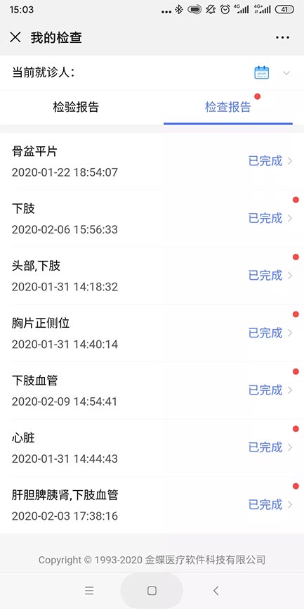 做完檢驗或者檢查之后,點擊【診療】—【檢驗檢查】檢驗科出來的報告從系統(tǒng)出來的第一時間會彈送到手機端,患者可以自己查看報告