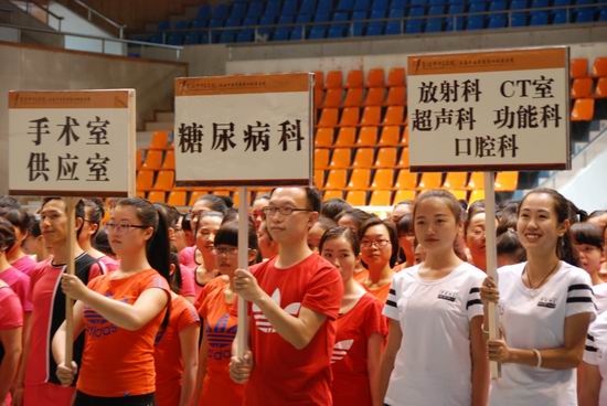 為迎接這天的比賽,各科室職工利用業(yè)余時間聚在一起認真訓(xùn)練,經(jīng)過近一個月的刻苦訓(xùn)練,終于迎來了“5.12國際護士節(jié)”。全院各臨床科室及職能部門共劃分成23個參賽隊,共400余名職工參加。比賽評委由院工會委員會委員擔任,在吳勇副院長致辭并宣布比賽開始后,各參賽隊身著整齊統(tǒng)一的服裝,伴隨著韻律優(yōu)美的廣播體操音樂,隊員們精神抖擻、認真準確地完成了每一個規(guī)定的動作。他們從容的表情和優(yōu)美的姿態(tài)構(gòu)成了一道亮麗的風(fēng)景,贏得了評委和觀眾的陣陣掌聲。從入場到退場,亮點頻出,盡展青春活力。
