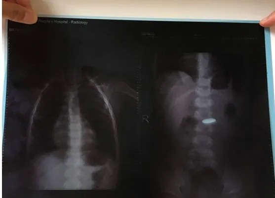 家長擔(dān)心孩子身體情況,帶著患兒來到當(dāng)?shù)乜h醫(yī)院就診,腹部平片提示中腹部異物存留,同時也給患兒多吃易排便的食物及督促患兒多運(yùn)動等方法,觀察10天后仍未發(fā)現(xiàn)硬幣排出。
