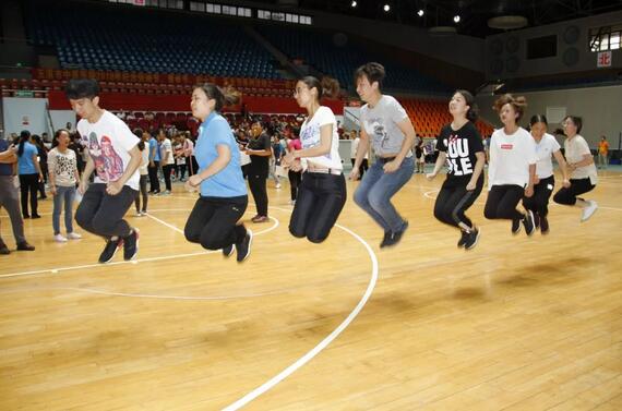 接下來,是體現(xiàn)團(tuán)隊協(xié)作能力的跳大繩比賽。當(dāng)哨聲一聲令下,隊員們一鼓作氣,整齊劃一的跳啊跳??;啦啦隊員們不約而同為各自的團(tuán)隊大聲地數(shù)著跳繩次數(shù)助威;臺上的觀眾們紛紛保持安靜,緊繃著心弦觀看比賽。