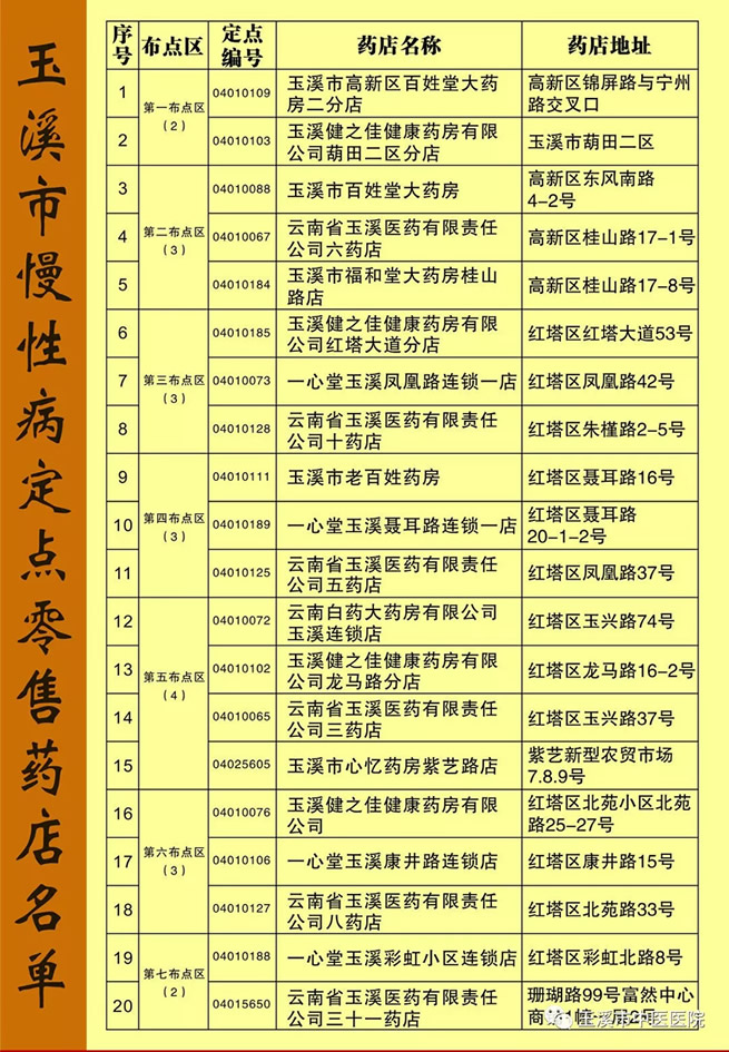 根據(jù)《玉溪市人力資源和社會保障局關于慢性病購藥放寬到定點零售藥店的通知》精神,決定將慢性病購藥放寬到我市部分定點零售藥店,以方便慢性病患者購藥和費用結(jié)算,緩解定點醫(yī)療機構就診壓力。全市準入慢性病購藥定點5家,市本級及紅塔區(qū)城區(qū)準入20家。